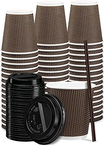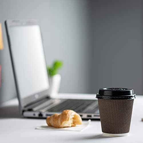 GUSTO [10 oz. - 50 Sets Insulated Brown Patterned Ripple Paper Hot Coffee Cups With Lids (Lids Color May Vary) - Ideal for Hot Beverages, Travel, and Office Use - (Formerly Comfy Package)