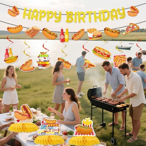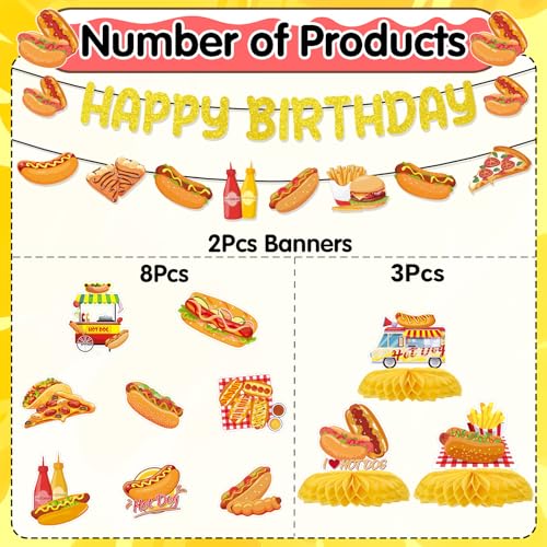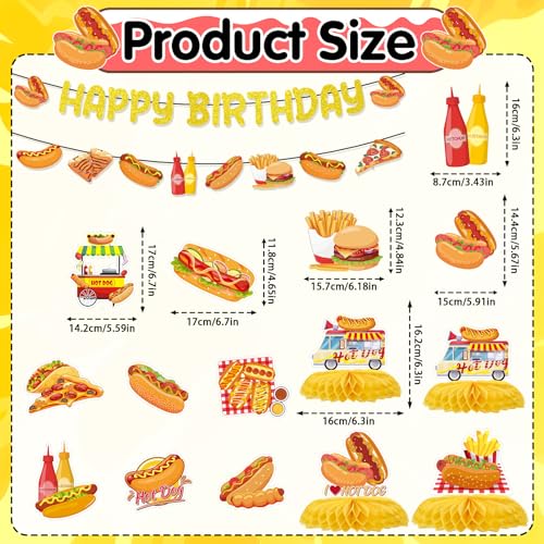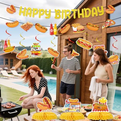 Hot Dog Birthday Party Decorations, 13PCS Hotdog Banners with Hanging Swirls Happy Bday Decoration Fast Food Honeycomb Centerpieces Decor Supplies