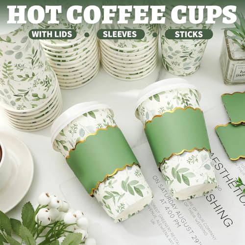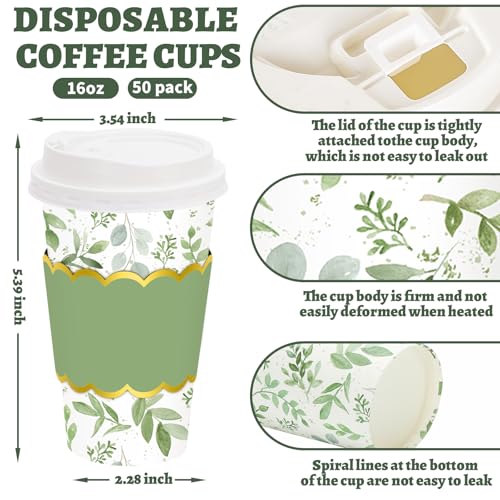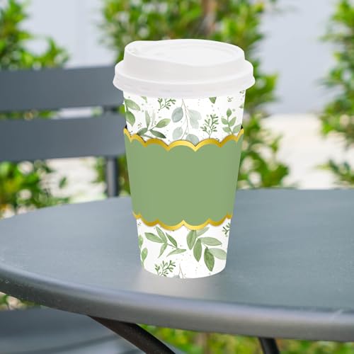 JarThenaAMCS 50Pcs Greenery Coffee Cups with Lids Sleeves 16oz Green Eucalyptus Leaves Paper Cups Disposable To Go Coffee Cups for Wedding Cafes Shops Cappuccino Chocolate Beverage Cocoa