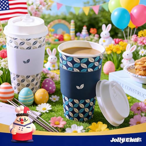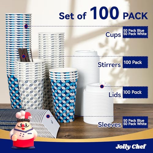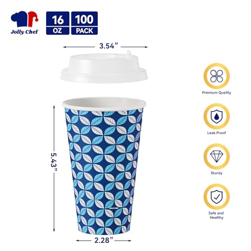 JOLLY CHEF 16 oz Coffee Cups with Lids 100 Pack, Disposable Hot Paper Coffee Cups with Lids, Sleeves and Stirrers for Christmas, Thanksgiving, Party