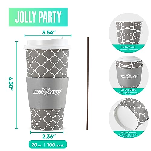 JOLLY PARTY [100 Sets] 20 oz Paper Coffee Cups, Disposable Coffee Cups with Lids,Sleeves and Straws, Hot Cold Beverage Drinking Cup for Water, Coffee or Tea, To-Go Cup Suitable for Office and Travel
