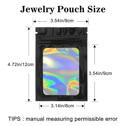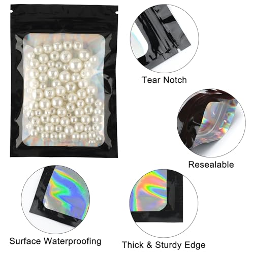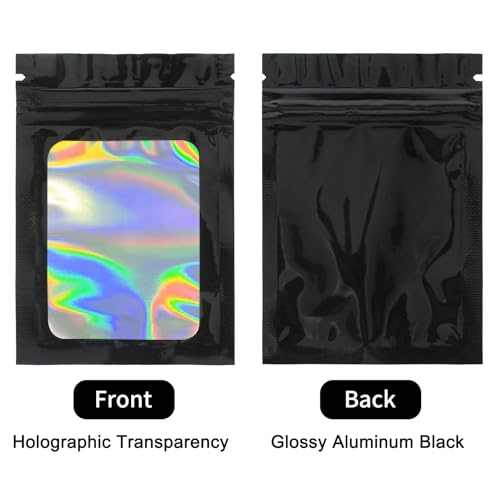 joycraft 100 Pcs Holographic Mylar Bags, Resealable Smell Proof Bags, Jewelry Pouch Bag, Clear Foil Pouch Bag for Candy, Data Cable, Lipgloss (Black, 3.5x4.7 In)