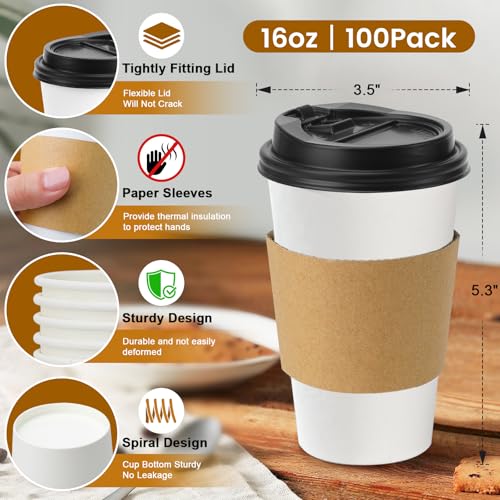 Lamosi 100 Pack 16 oz Disposable Coffee Cups with Lids and Sleeves, Leak-Proof To Go Paper Coffee Cups with Lids, Hot/Cold Beverage White Drinking Cup for Home, Office, Parties, Travel