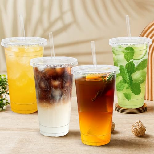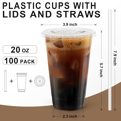 Lamosi 100 Pack 20 oz Clear Plastic Cups with Lids and Straws, Disposable Iced Coffee Cups with Lids for To-Go Cold Drinks, Smoothies and Slushie
