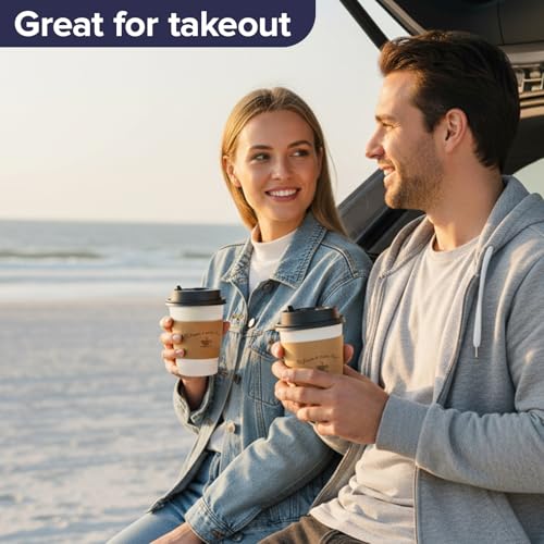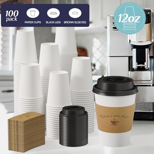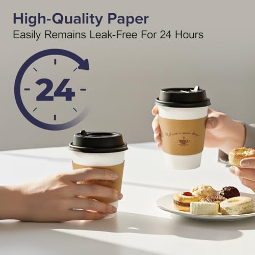 LITOPAK 100 Pack 12 oz Disposable Coffee Cups with Lids and Kraft Sleeves, Leak-Proof White To Go Coffee Cups for Office, Cafe, Catering, Events and Daily Commute