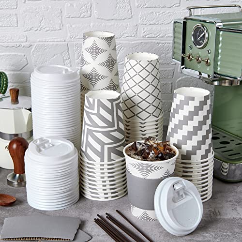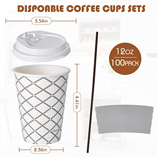 LITOPAK 100 Pack 12 oz Paper Coffee Cups with Lid, Sleeve, and Straws, Four Designs of Disposable Hot Coffee Cups for Home, Stores, and Cafes