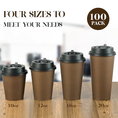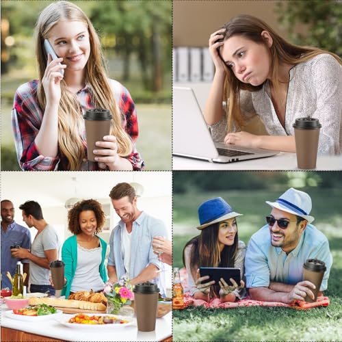 LITOPAK 100 Pack 16 oz Disposable Paper Coffee Cups with Lids for Coffee, Water, Juice, or Tea, Brown Hot Paper Cups for Home, Restaurant, Store, and Cafe