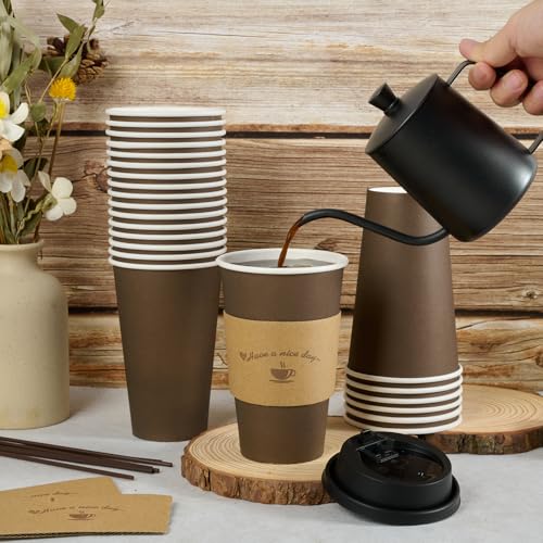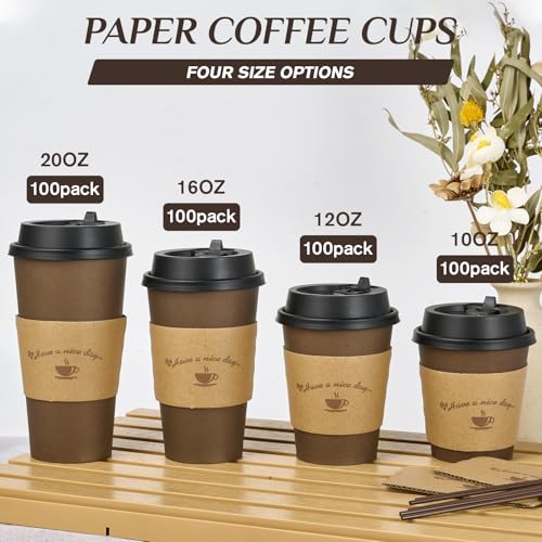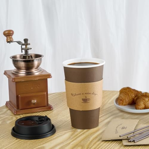 LITOPAK 100 Pack 16 oz Paper Coffee Cups, Brown Disposable Coffee Cups with Lids, Sleeves, Sticks, Drinking Cups for Hot Coffee, Water or Juice, Hot Paper Cups for Home, Restaurant, and Store