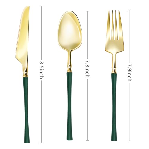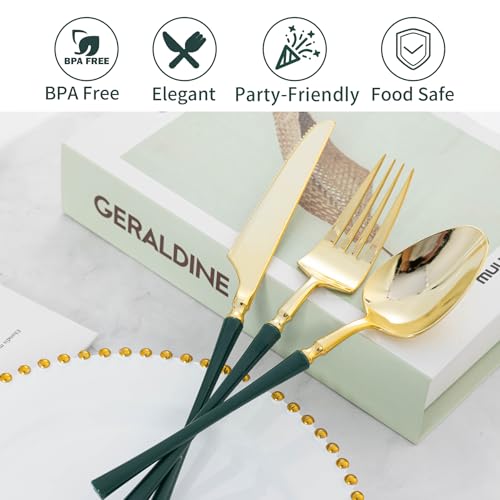 Lullaby 150pcs Gold Plastic Silverware, High End Disposable Cutlery with Dark Green Handle Include 50 Forks, 50 Spoons, 50 Knives, Elegant Silverware for Wedding, Party, Gathering and Daily Use