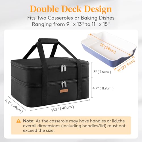 LUNCIA Insulated Double Decker Casserole Carrier, Lasagna Lugger Tote Keeps Food Hot or Cold, Thermal Lunch Bag for Potluck Parties, Picnic and Cookouts, Fits 9" x 13" Baking Dish, Black