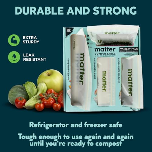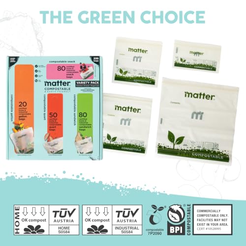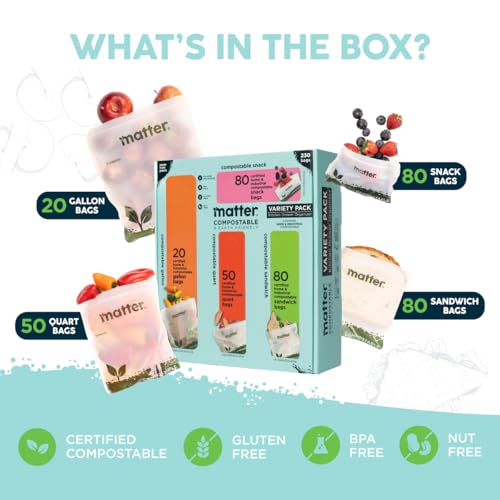 Matter Compostable Assorted Kitchen Bags, 230 Count, Biodegradable, Eco-Friendly Resealable Food Storage Variety Pack, 80 Snack, 80 Sandwich, 50 Quart & 20 Gallon