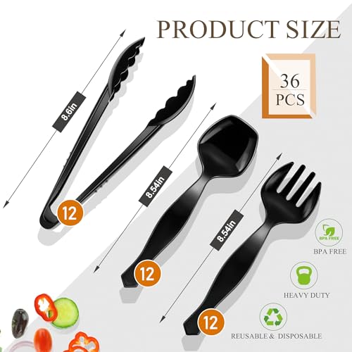 Mwellewm 36Pcs Plastic Serving Utensils Set Large Disposable Serving Spoons Forks Tongs for Serving Food 8.5'' Heavy Duty Black Large Party Utensils Supplies for Buffet Restaurant Dinner Salad Soup