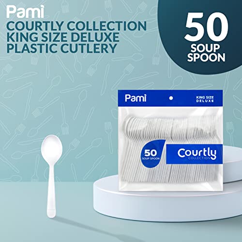 PAMI Heavy-Weight Disposable Plastic Soup Spoons [50-Pack] - Bulk King Size Deluxe White Plastic Silverware For Parties Weddings Caterings Food Stands Takeaway- Heavy-Duty Single-Use Party Spoons