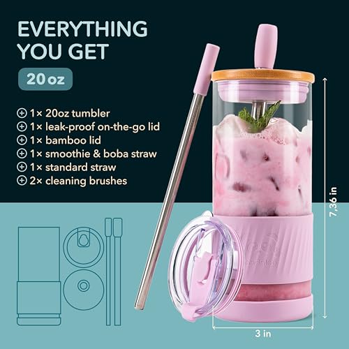 Pandaloo® Glass Cups With Lids and Straws -20 Fl Oz- Perfect Size Iced Coffee Cup - Smoothie Cup With Bamboo Lid and On the go Lid - Glass Tumbler With Straw (1 Count (Pack of 1), Lilac Rhapsody)