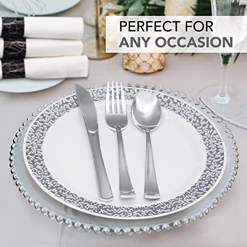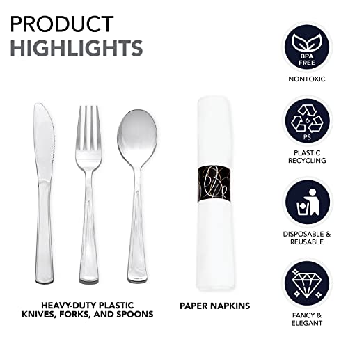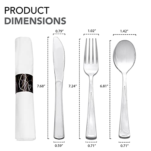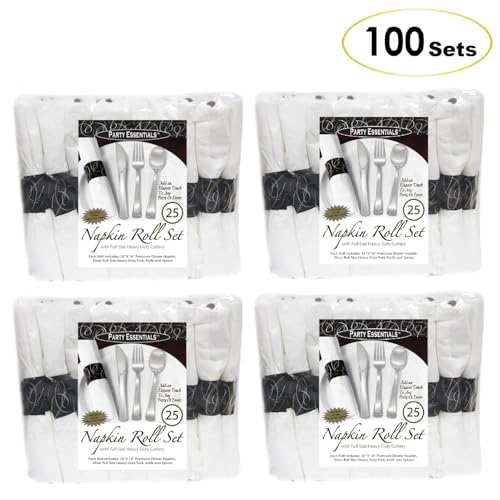 Party Essentials Pre-Rolled Disposable Extra Heavy Duty Plastic Cutlery Kit with Silver Fork/Knife/Spoon and 3-Ply White Napkin (Case of 100 Rolls), (N501725-4)
