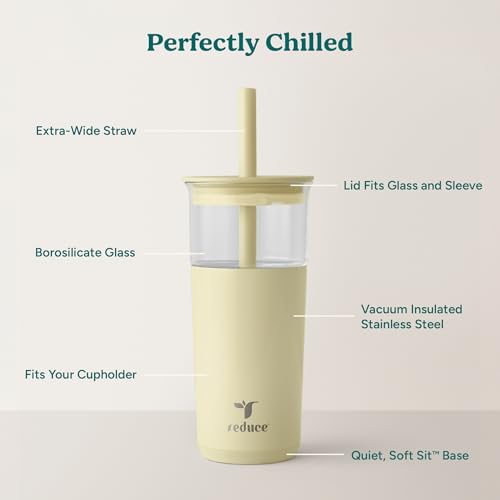 REDUCE Aspen 20 oz Vacuum Insulated Glass Tumbler with Lid & Extra Wide Straw - Keeps Drinks Cold for 12 Hrs - Ideal for Iced Coffee, Smoothies & Boba - Dishwasher Safe, Soft Base - French Vanilla
