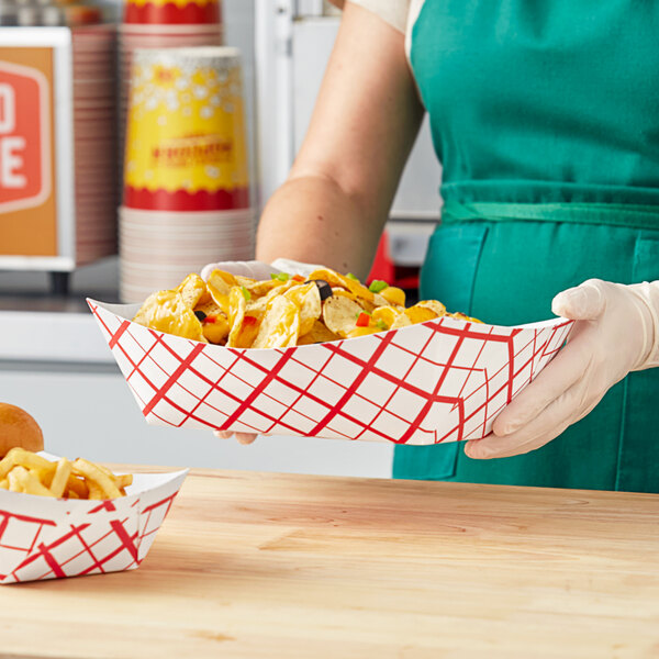 Quantity: 250/Case | Shipping Weight: 16.1 lb. | Height: 2 1/2 Inches | Bottom Length: 7 1/4 Inches | Top Length: 9 13/16 Inches | Bottom Width: 4 3/8 Inches | Top Width: 6 15/16 Inches | Capacity: 10 lb. | Color: Red | Design: Printed Red Check | Features: Grease-Resistant Made in America No PFAS Added Recyclable | Material: Paper | Number of Compartments: 1 Compartment | Shape: Rectangle | Type: Boat Trays
