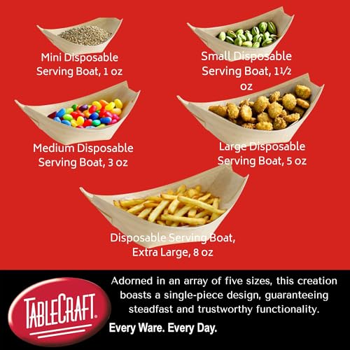 Brand Name: Tablecraft | Color: Brown | Finish Types: Textured | Included Components: 50 Boats | Is the item dishwasher safe?: No | Is the item microwaveable?: Yes | Item Dimensions L x W x Thickness: 5.3"L x 1.5"W x 3.3"Th | Item Type Name: Appetizer Plates | Item Weight: 6.8 g | Manufacturer: Tablecraft Products | Manufacturer Part Number: BAMDB5 | Material Type: Poplar, Wood | Model Number: BAMDB5 | Net Content Weight: 0.03 Pounds | Number of Pieces: 50 | Occasion Type: Cinco de Mayo | Other Special Features of the Product: Break Resistant, Eco-Friendly, Lightweight | Pattern: Solid | Product Care Instructions: Disposible | Recommended Uses For Product: Appetizer | Reusability: Disposable | Seasons: All Seasons | Shape: Rectangular | Size: Medium, 3 Oz | Style Name: Classic | Unit Count: 50.0 Count