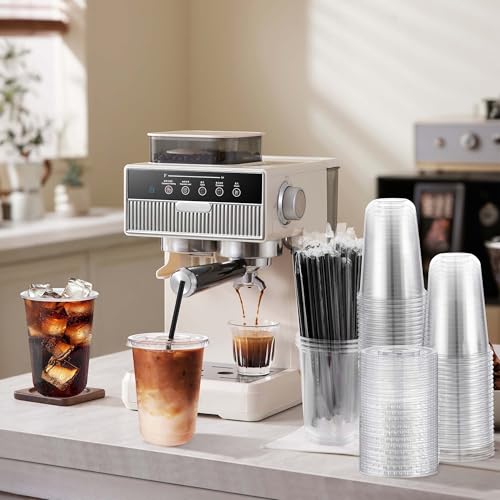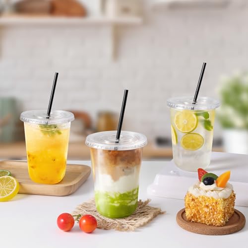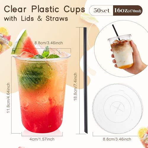 tchrules 50 Set 16oz Clear Plastic Cups with Lids & Straws, Disposable Iced Coffee Cup with Lid, Round Bottom To Go Cups for Cold Drinks Slushie Smoothie Lemonade Soda Bar Party Cafe Shop Supplies