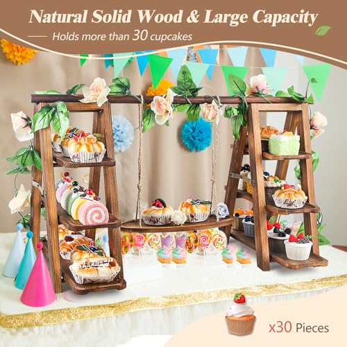 Wooden 3 Tier Cupcake Stand with Swing and Flower Decoration Serving Removable Tray Display Serving Ladder Foldable Stand with Serving Platter Tray Party Food Display Set for Cake Snack Fruit Chips Bread Centerpieces Catering