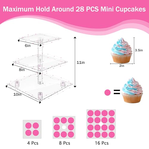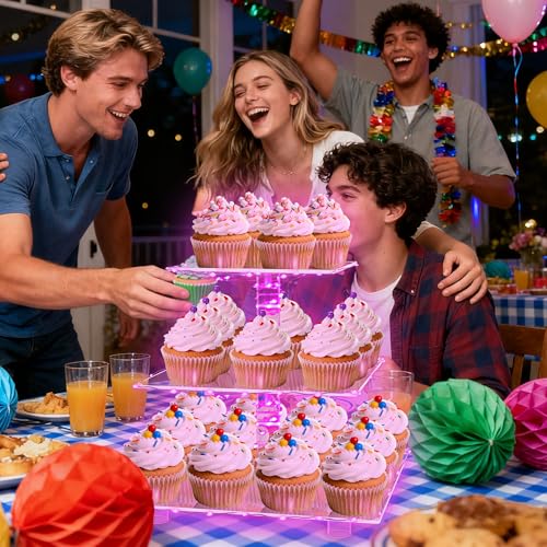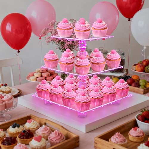 YestBuy 3 Tier Square Cupcake Stand - Premium Cupcake Holder - Acrylic Cupcake Tower Display - 3 Tier Acrylic Display for Pastry + LED Light String - Ideal for Weddings, Birthday Parties( Pink Light)
